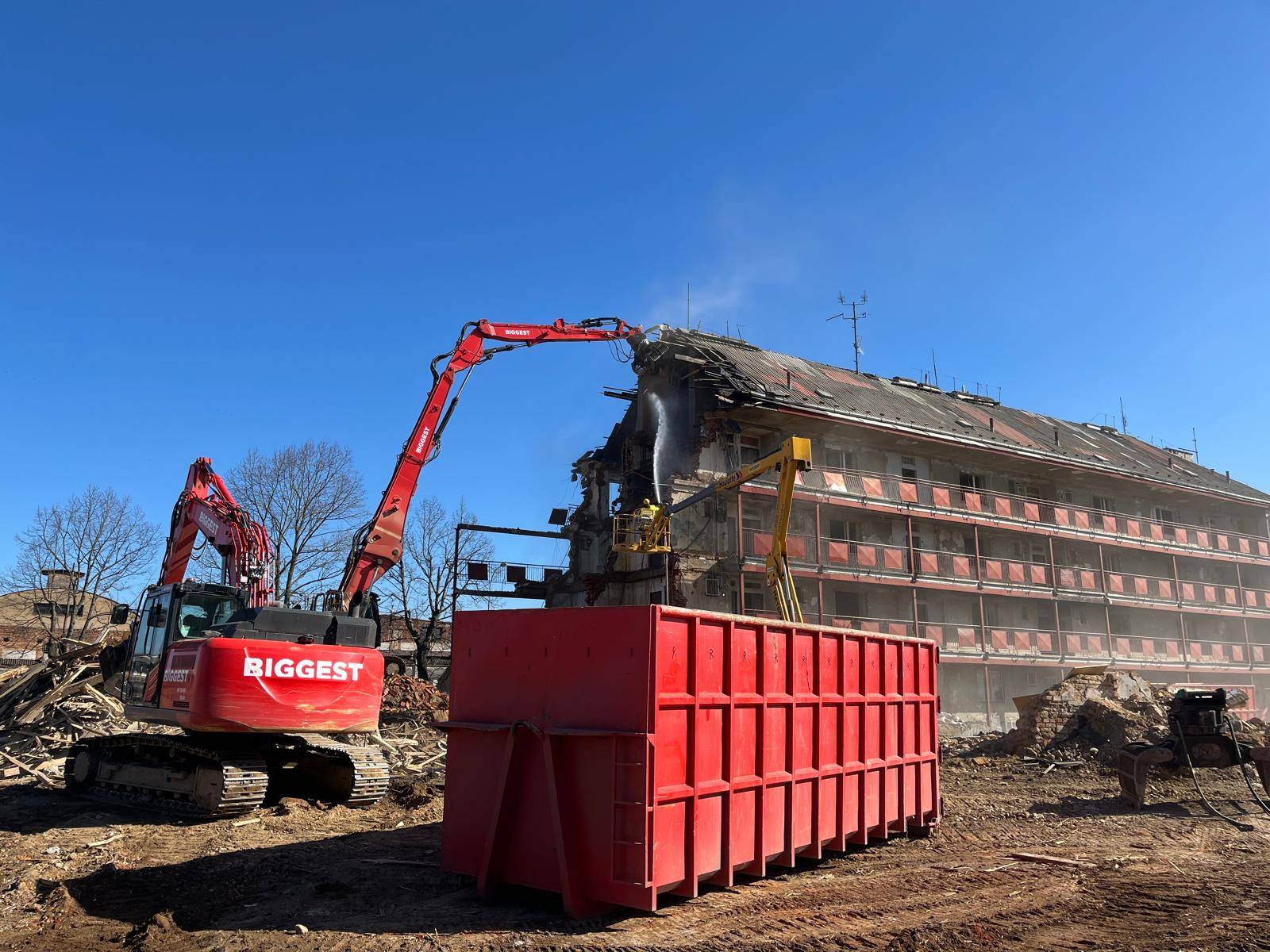 V roce 2025 jsme realizovali kompletní odstranění pavlačového domu v Plzni. Zakázka zahrnovala demolici nadzemních částí i vybourání základů. Před samotným bouráním jsme provedli vyklizení objektu včetně odvozu komunálního odpadu a zajistili demontáž a likvidaci azbestu. Výškové části stavby byly rozebrány pomocí našeho demoličního rypadla s dosahem 24 metrů. Veškeré demoliční odpady jsme roztřídili a odvezli k dalšímu zpracování na naše recyklační centrum. Území bylo po dokončení prací upraveno a rekultivováno.